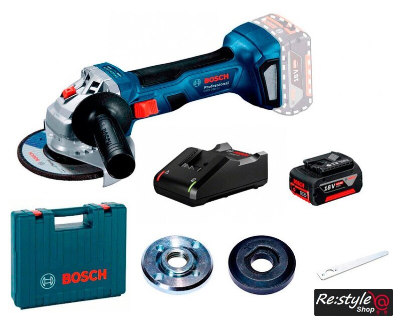 Комплект поставки | - Опорный фланец- Зажимная гайка- Ключ под два отверстия- Дополнительная рукоятка - Защитный кожух- Быстрозарядное устройство GAL 18V-40 Professional- Чемоданчик- 1 аккумулятор |