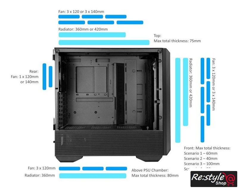 | Расположение СЖО | Спереди: 360 мм или 420 ммВерх: 360 мм или 420 ммНад камерой блока питания: 360 мм |