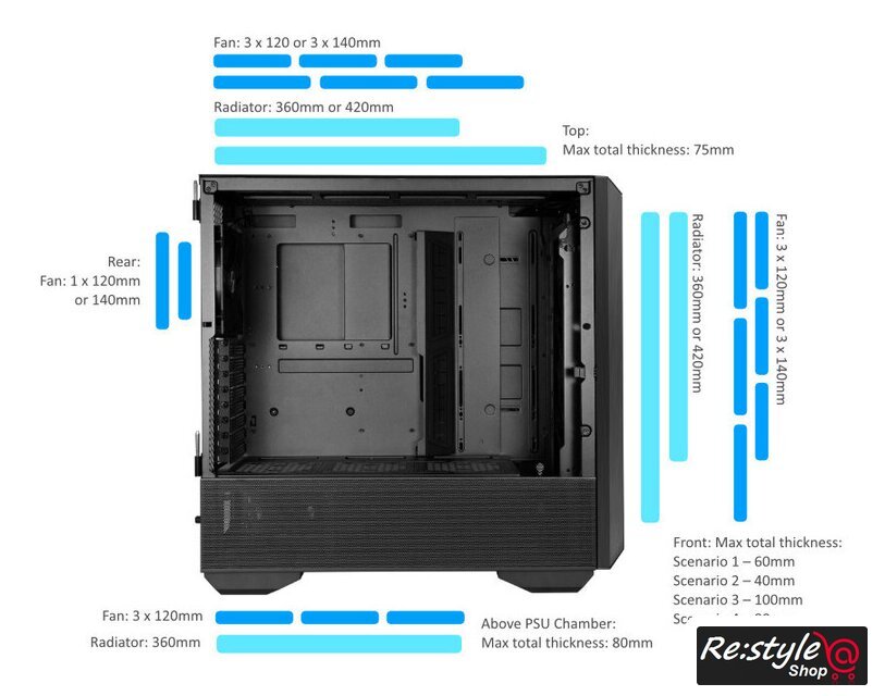 | Расположение СЖО | Спереди: 360 мм или 420 ммВерх: 360 мм или 420 ммНад камерой блока питания: 360 мм |