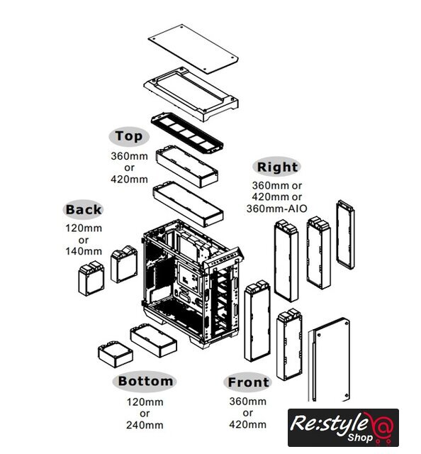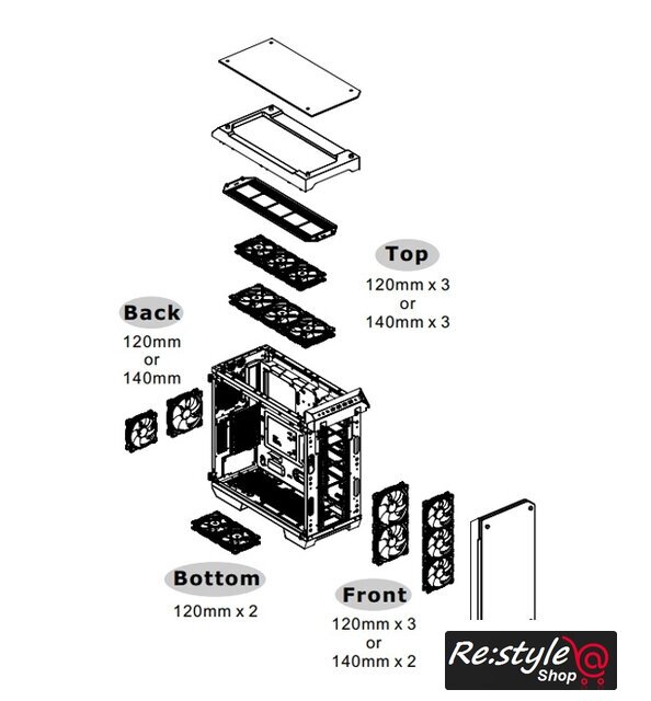 | Количество мест для вентиляторов | 9 (спереди: 3 x 120mm , 2 x 140mm сверху: 3 x 120mm , 3 x 140mm сзади: 1 x 120mm, 1 x 140mm снизу: 2 x 120mm) |