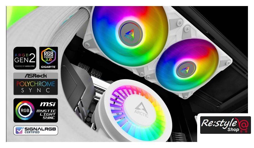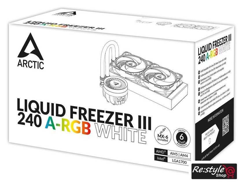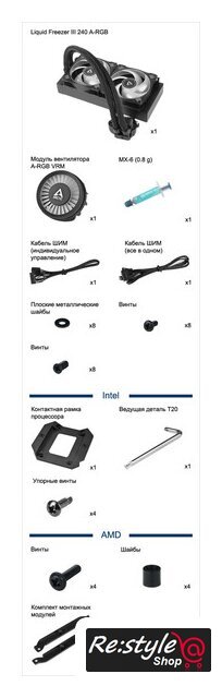 Комплектация | 1x Liquid Freezer III 240 A-RGB1x Модуль вентилятора VRM1x MX-6 (0.8 g)1x Кабель ШИМ (индивидуальное управление) 1x Кабель ШИМ (все в одном) 8x Плоские металлические шайбы16x ВинтыIntel1x Контактная рамка процессора 1x Ведущая деталь T204x Упорные винтыAMD4x Винты4x Шайбы1x Комплект монтажных модулей |
