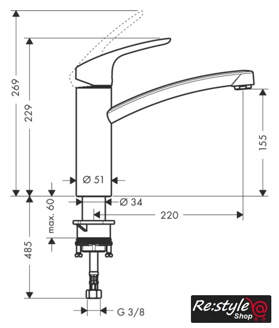 Длина (вылет) излива 220 мм