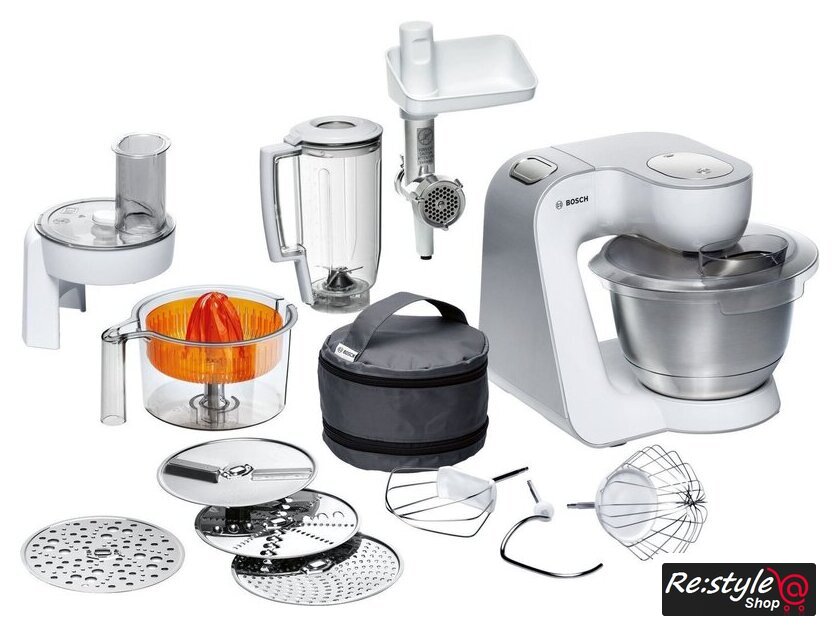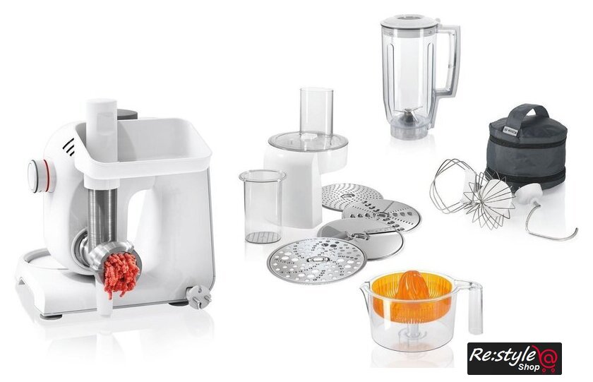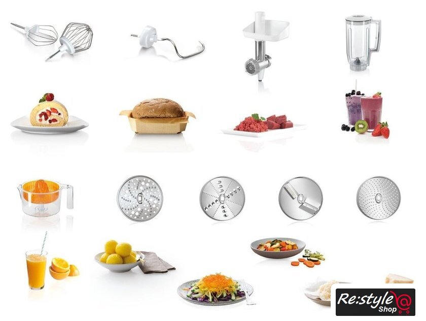 | Функции | мясорубка, блендер, цитрус-пресс, взбивание, смешивание, замешивание дрожжевого теста, терка, шинковка, ломтерезка, драники |
