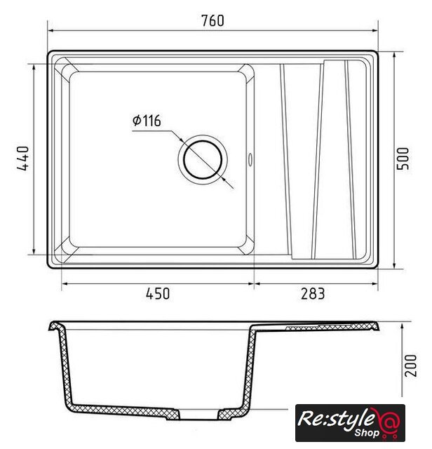 врезная на столешницу, искусственный камень, размеры: 76x50 см, в шкаф 60 см