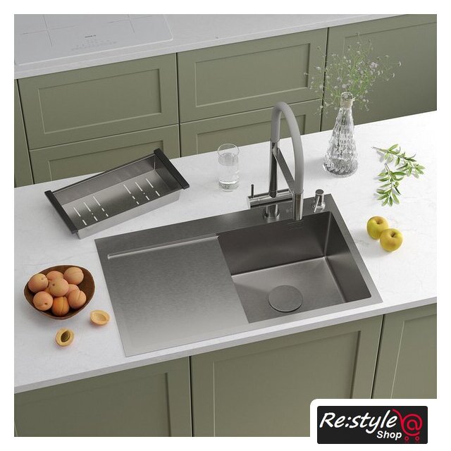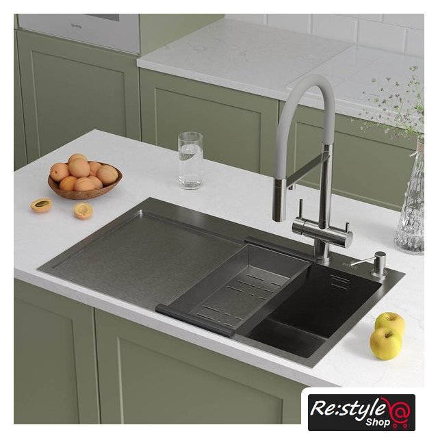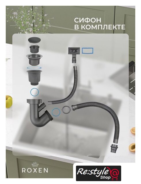 Комплектация | сифон с гофрой, коландер из нержавеющей стали, дозатор для моющих средств, корзинчатый вентиль, 2 заглушки на отверстия, комплект креплений к столешнице |