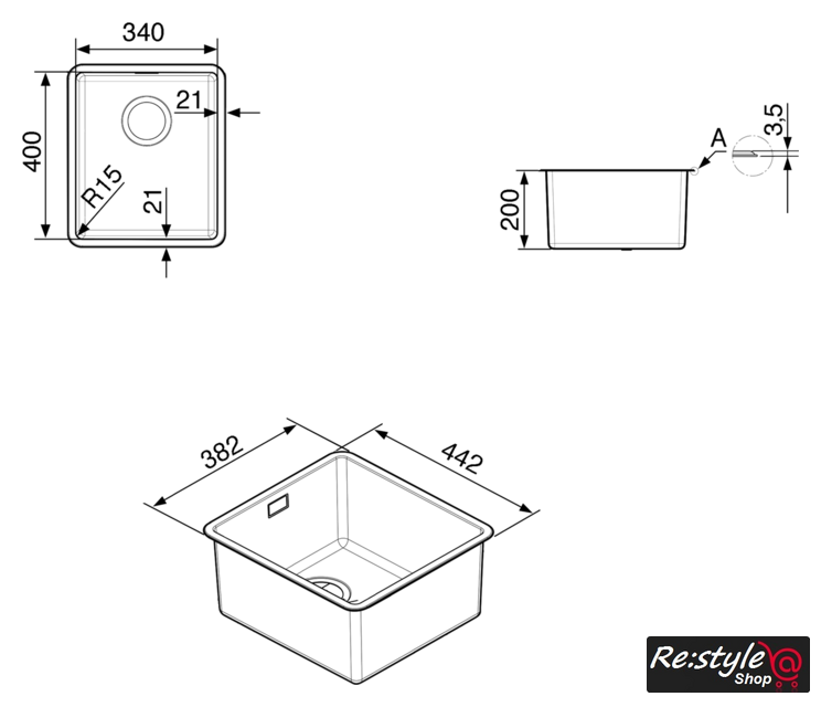 врезная под столешницу, нержавеющая сталь, размеры: 38.2x44.2 см, в шкаф 45 см
