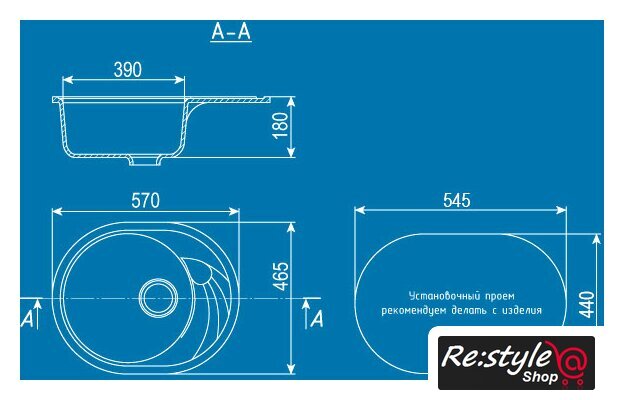 врезная на столешницу, искусственный камень, размеры: 57x46.5 см, в шкаф 45 см