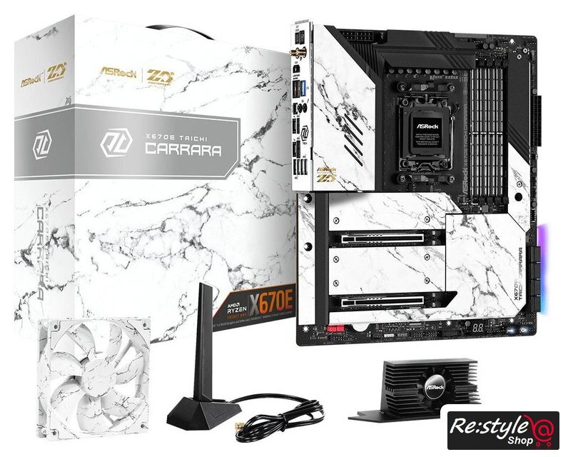 | Комплектация | - 1 x Инструкция для пользователя- 4 x кабелей SATA- 1 x Скоба для беспроводного адаптера USB- 1 x Вентилятор для радиатора Blazing M.2 Gen5- 1 x 12CM Вентилятор Carrara Edition- 1 x ASRock WiFi 2.4/5/6 ГГц Антенны- 4 x Винты для разъемов M.2- 1 x Стойки для розеток М.2 |