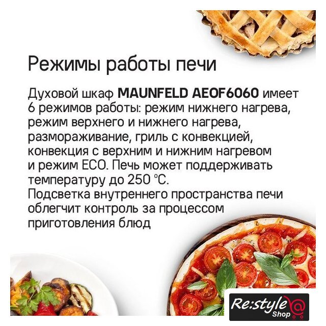 Режимы работы | нижний нагрев, двухсторонний нагрев, гриль + конвекция, двухсторонний нагрев + конвекция, размораживание |