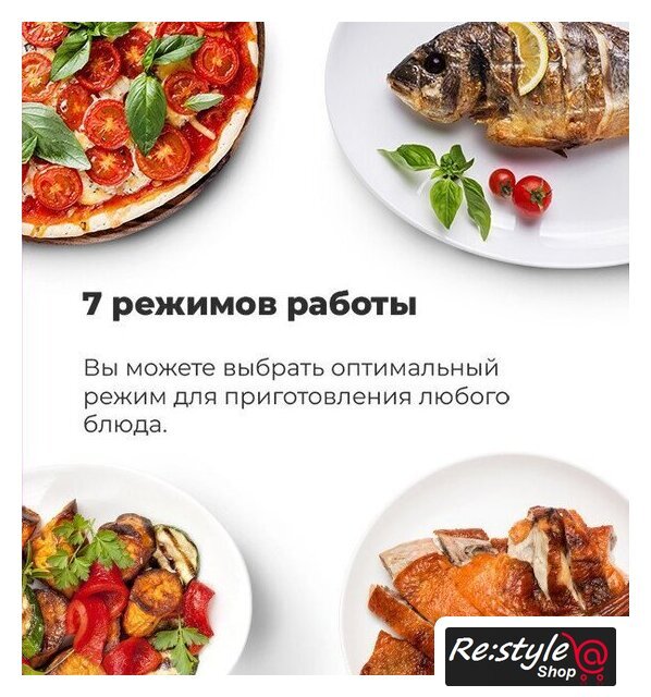 | Режимы работы | нижний нагрев, двухсторонний нагрев, большой гриль, нижний нагрев + конвекция, двухсторонний нагрев + конвекция |