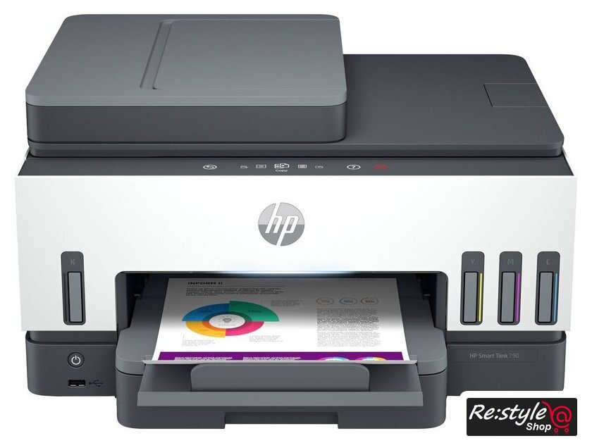 Комплектация | МФУ HP Smart Tank 790; 3 бутылочки с оригинальными черными чернилами HP GT53XL (135 мл); бутылочка с оригинальными голубыми чернилами HP GT52; бутылочка с оригинальными пурпурными чернилами HP GT52; бутылочка с оригинальными желтыми чернилами HP GT52; кабель питания; PHA; руководство по установке; справочное руководство; листовка о безопасности при использовании чернил; листовки с нормативными требованиями; листовки с условиями гарантии |