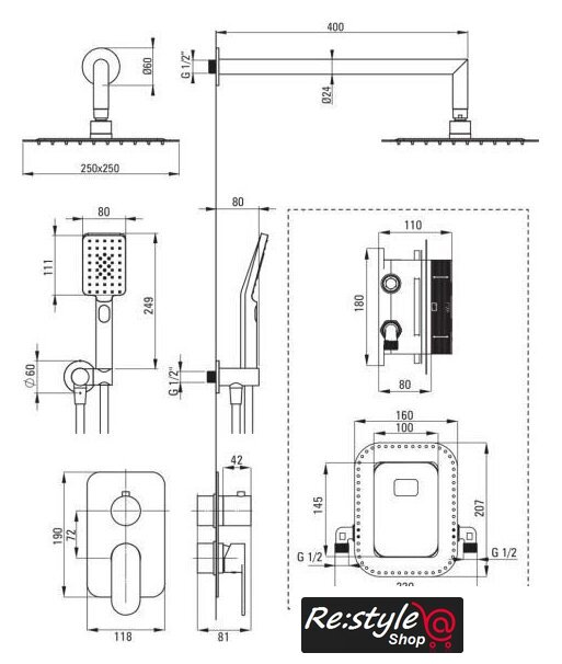 | Диаметр (ширина) верхнего душа | 250 мм |