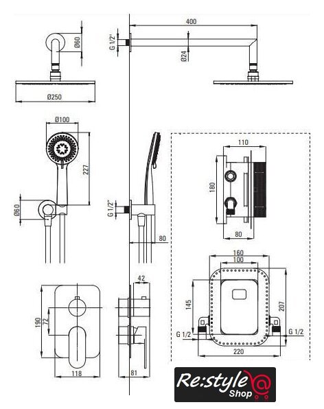 Диаметр (ширина) верхнего душа | 250 мм |