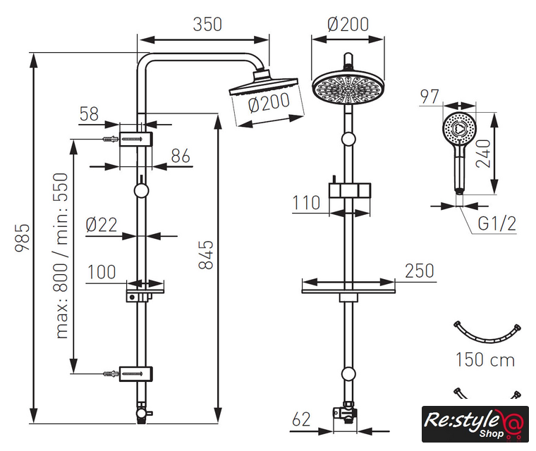 | Диаметр (ширина) верхнего душа | 200 мм |
