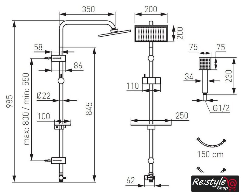 | Комплектация | верхний душ, штанга, ручной душ (лейка), держатель лейки, шланг, полочка |