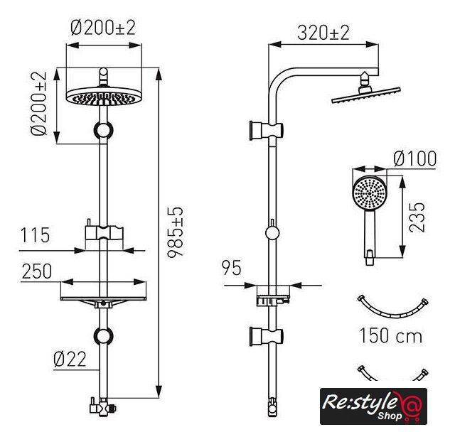 | Комплектация | верхний душ, штанга, ручной душ (лейка), держатель лейки, шланг, полочка |