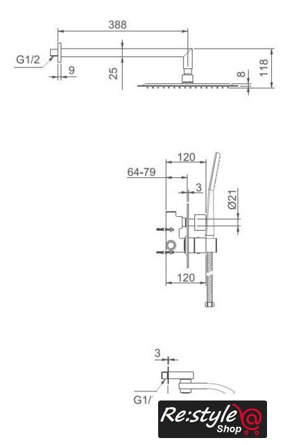 Комплектация | верхний душ, ручной душ (лейка), держатель лейки, шланг, смеситель, излив для ванны |
