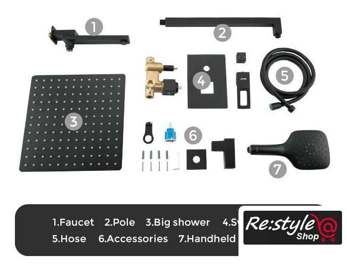| Комплектация | верхний душ, ручной душ (лейка), держатель лейки, шланг, смеситель, излив для ванны |
