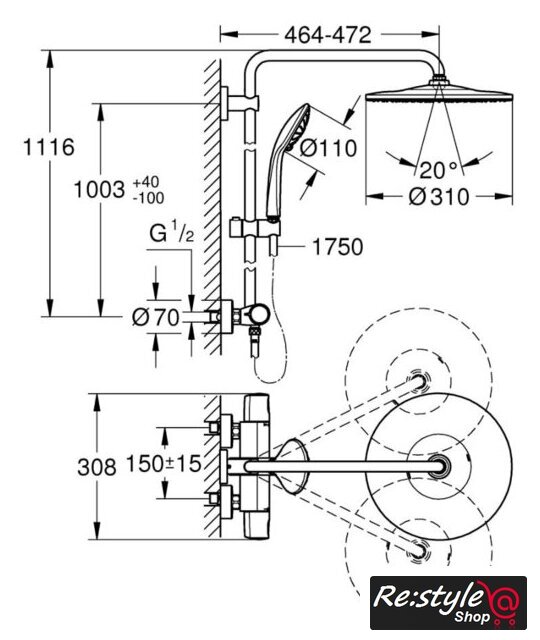 | Вылет верхнего душа | 472 мм |
