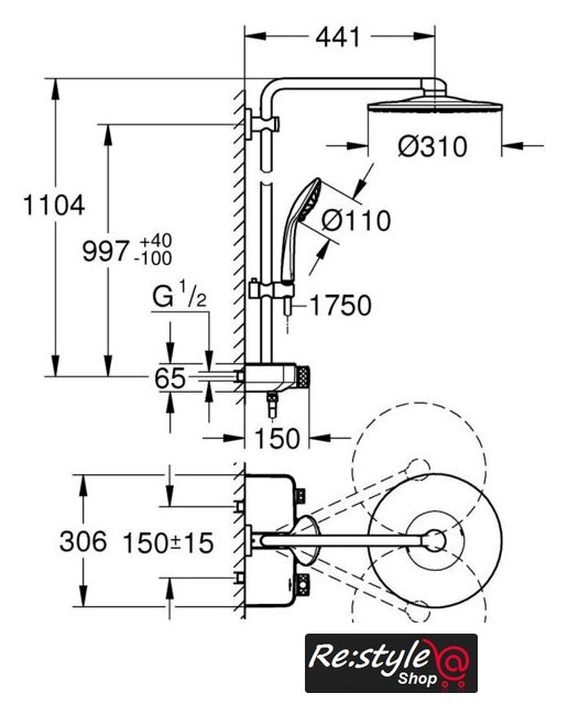 | Вылет верхнего душа | 441 мм |