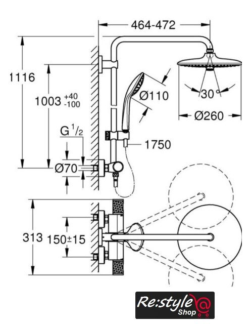 | Вылет верхнего душа | 472 мм |