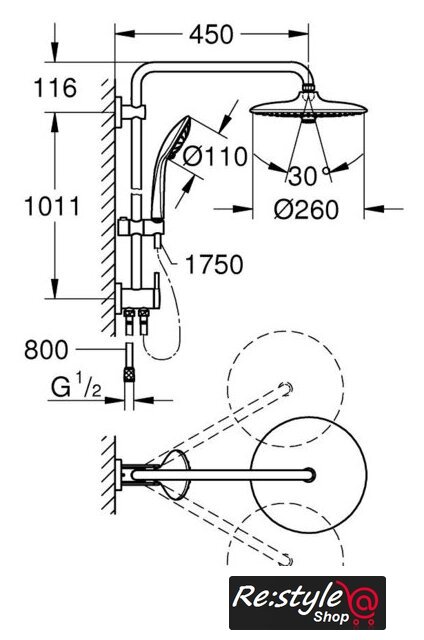 | Диаметр (ширина) верхнего душа | 260 мм |