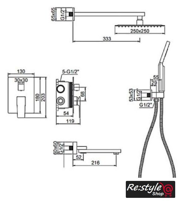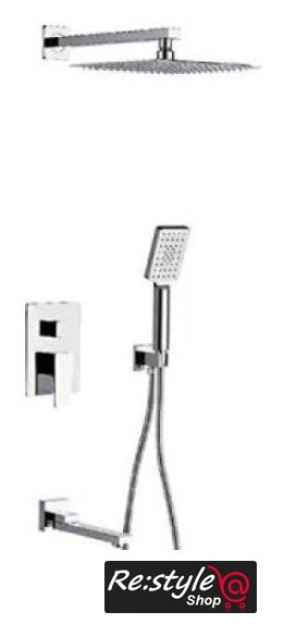 | Комплектация | верхний душ, ручной душ (лейка), держатель лейки, шланг, смеситель, излив для ванны |