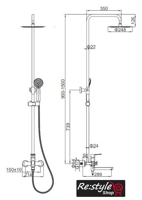 | Комплектация | верхний душ, штанга, ручной душ (лейка), держатель лейки, шланг, смеситель, излив для ванны |