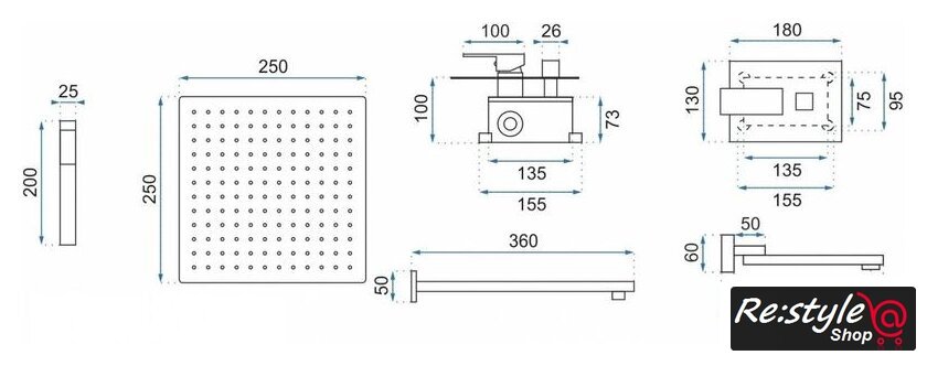 | Диаметр (ширина) верхнего душа | 250 мм |