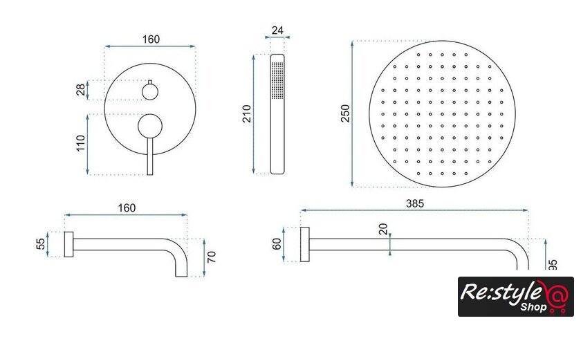 | Диаметр (ширина) верхнего душа | 250 мм |