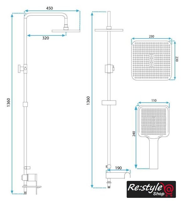 | Комплектация | верхний душ, штанга, ручной душ (лейка), держатель лейки, шланг, смеситель, излив для ванны |