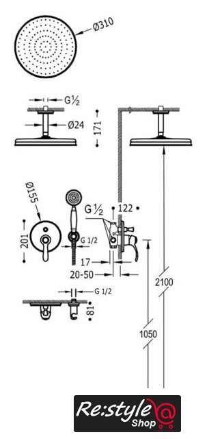 | Диаметр (ширина) верхнего душа | 310 мм |