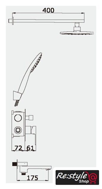 | Комплектация | верхний душ, ручной душ (лейка), держатель лейки, шланг, смеситель, излив для ванны |