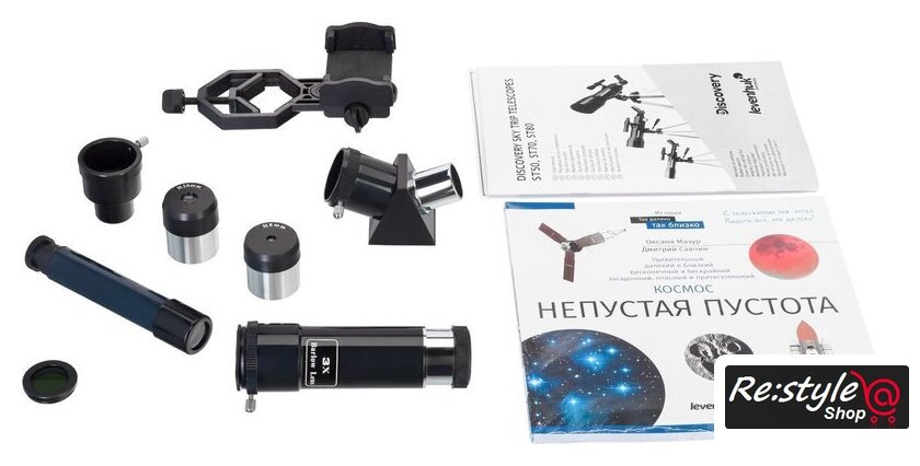 | Комплект поставки | Оптическая труба телескопа, азимутальная монтировка, алюминиевая тренога, оптический искатель 2х, окуляр H8 мм, 1,25", окуляр H20 мм, 1,25", диагональная призма, линза Барлоу 3х, адаптер для смартфона, рюкзак для переноски, книга знаний «Космос. Непустая пустота», инструкция по эксплуатации и гарантийный талон. |