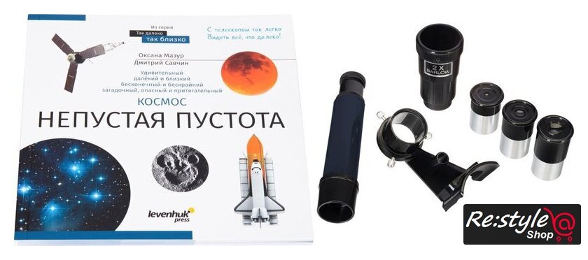 | Комплект поставки | Оптическая труба телескопа, Окуляр SR4 мм, Окуляр H12,5 мм, Окуляр H20 мм, Оптический искатель 5х24, Линза Барлоу 2х, Азимутальная монтировка, Алюминиевая тренога с лотком для аксессуаров, Книга знаний «Космос. Непустая пустота», Инструкция по эксплуатации и гарантийный талон |