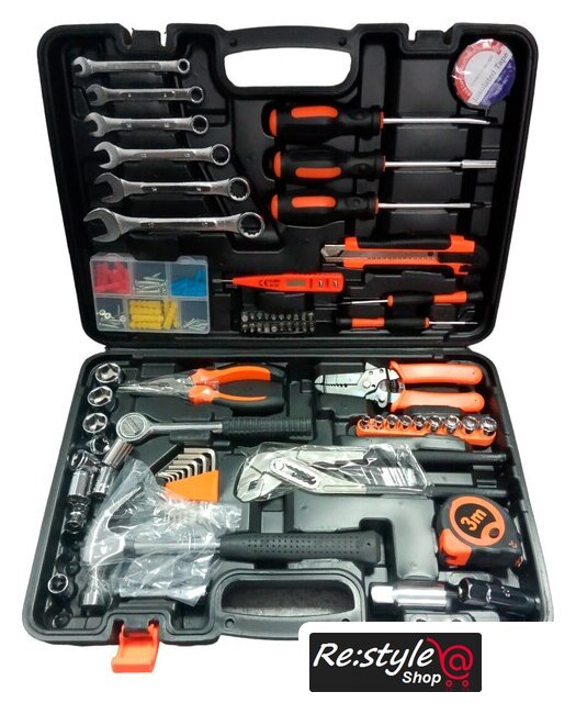 Комплектация | Переставные клещи -1шт Длинногубцы 6" - 1штСтриппер для зачистки проводов -1штКомбинированный ключ -6 штНабор ключей шестигранников - 8штМолоток-1 штОтвертка 2штНабор отверток для точечных работ 2 штИндикаторная отвертка -пробник 1штИзолента 1штРулетка 3м-1штМонтажный нож-1штТорцевые головки 1/4-9штГоловка торцевая свечная 3/8 16мм-1штГоловка торцевая свечная 3/8 21мм-1штУдлинитель 3/8" 75мм-1штТрещотка 3/8"-1штТорцевые головки 3/8-10штОтвертка-битодержатель -1штНабор бит 25мм 9штБита - адаптер для торцевых головок 1штНабор бит 50мм 10штНабор крепежа 1штКейс 1шт |