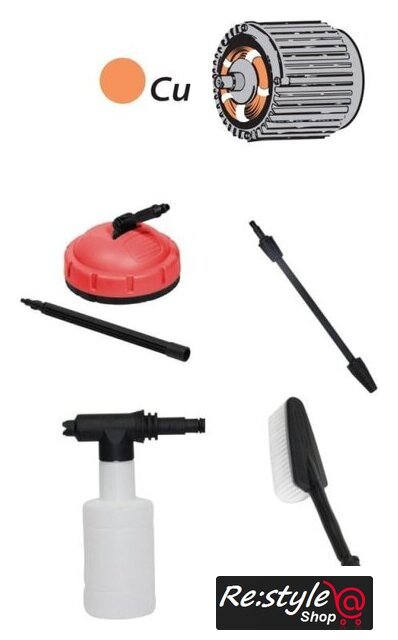 | Комплектация | - Мойка- Шланг для воды 6 м - Пистолет-распылитель - Насадка с регулируемой шириной распыления - Копье с вращающейся насадкой - Щетка - Насадка для твердых поверхностей- Пенокомплект- Держатель пистолета - Держатель шнура питания - Заглушка с фильтром - Игла для очистки сопла |