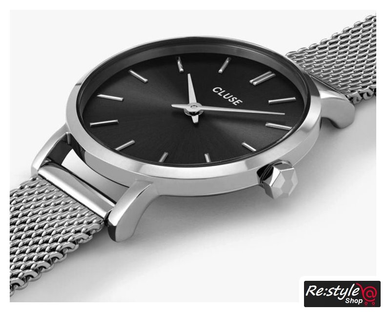 серебристый корпус, белый циферблат, серебристый браслет, миланский ремешок