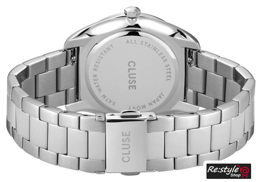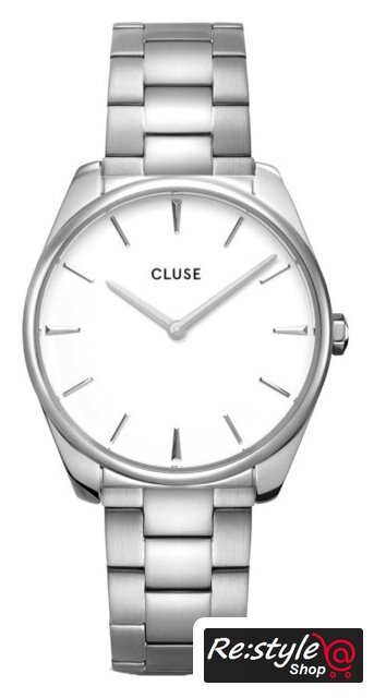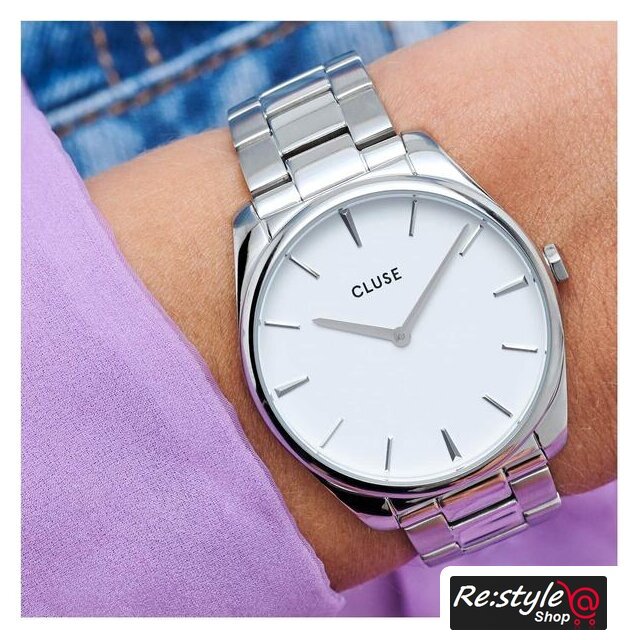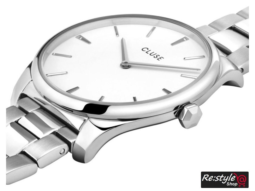 серебристый корпус, белый циферблат, серебристый браслет, миланский ремешок
