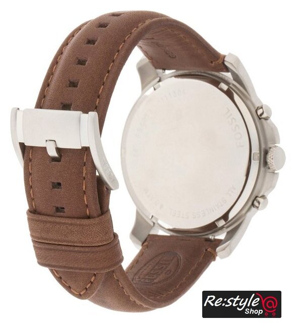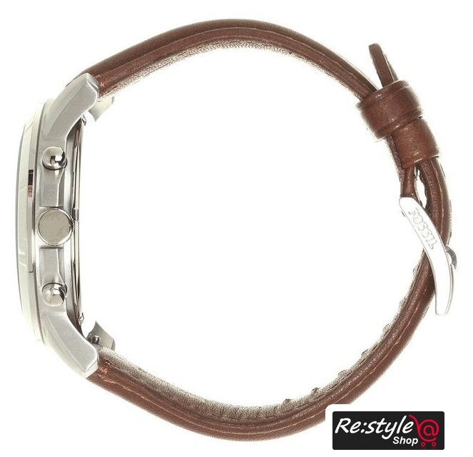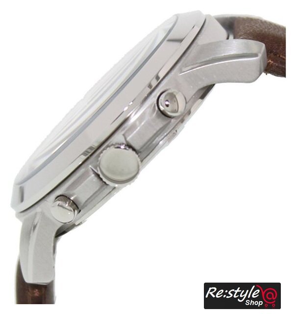 серебристый корпус, белый циферблат, коричневый браслет, кожаный ремешок