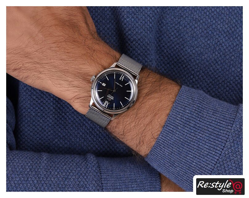 серебристый корпус, синий циферблат, синий браслет, кожаный ремешок